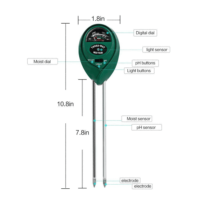 De 3-in-1 bodemtester kan tegelijkertijd de lichtintensiteit, de bodemvochtigheid en de pH-waarde meten. Kan zowel binnen als buiten worden gebruikt. (kan niet worden gebruikt voor het meten van de pH-waarde van water)